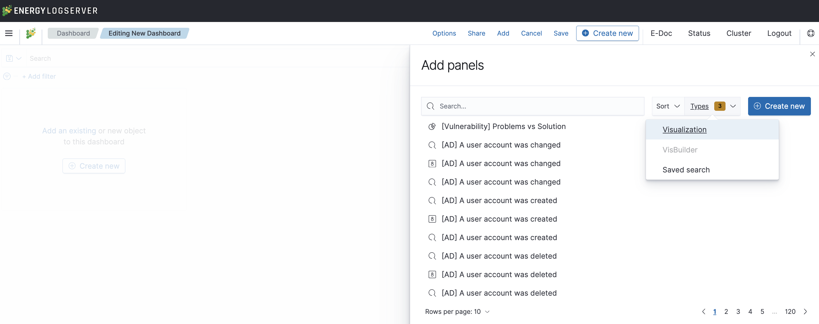 Clicking on the icon “Add” at the top of the page select the “Visualization” or “Saved Search” tab.