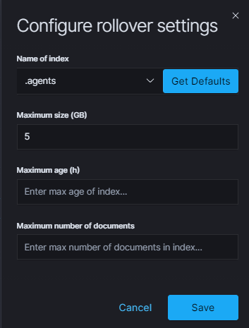 Using the rollover function, you can make changes to removing documents from the audit, .agents, and alert* indexes.