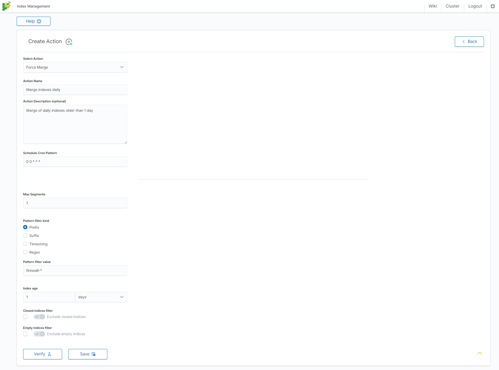This action forces the daily merge of indices older than two days. The action is performed daily at 01:00.