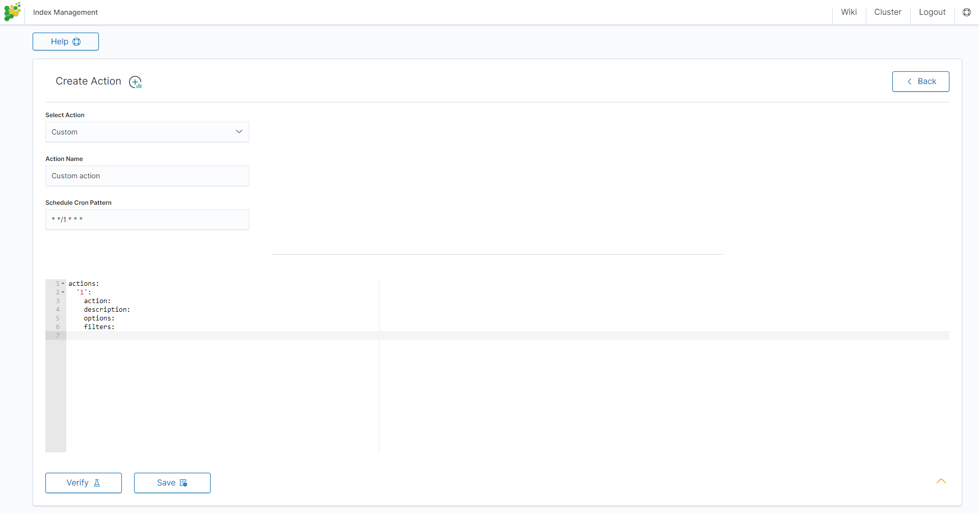 To create a Custom action, select Custom from Select Action, enter a name in the Action Name field, and set the schedule in the Schedule Cron Pattern field. In the edit field, enter the definition of a custom action: