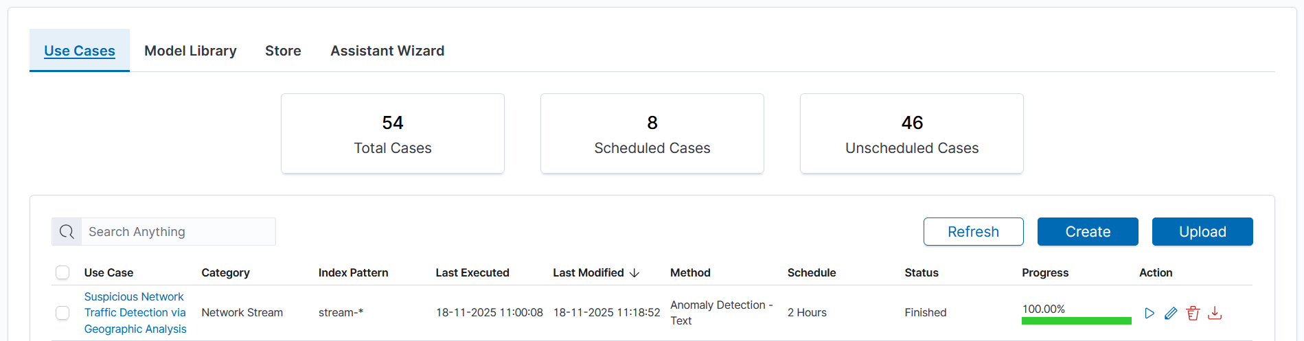 Use Case- unique name for the rule running on selected dataCategory- given category name upon createIndex Pattern- data to work withLast Executed- date when last use case was ExecutedLast Modified- when last use case configuration was changedMethod- selected algorithmSchedule- configuration of scheduling optionsStatus- current calculation statusProgress- progress bar in %Action- additional use case management