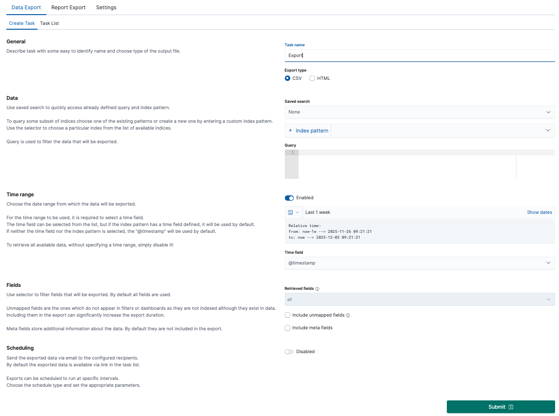We can also check which fields are to be included in the report. The selection is confirmed by the Submit button.