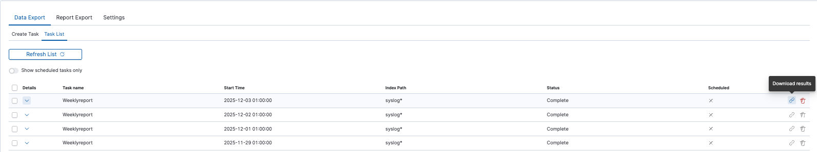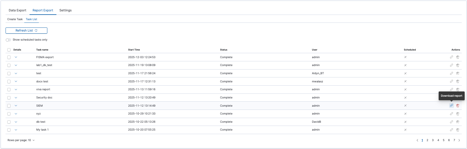 After completing the task, the status will change to ‘Complete’ and you can download the PDF report via ‘Action’ -> ‘Download’:
