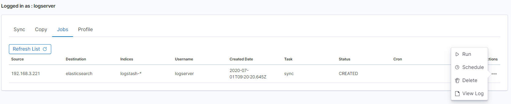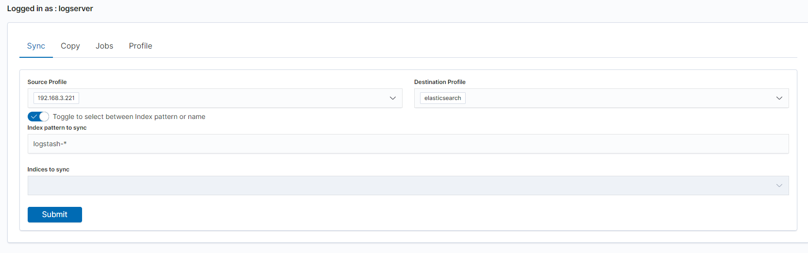 The Sync/Copy module allows you to synchronize or copy data between two Energylogserver clusters. You can copy or synchronize selected indexes or indicate index pattern.