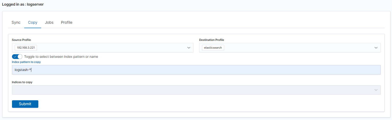 Toggle to select between Index pattern or nameand enter indices name.to start copying data press the