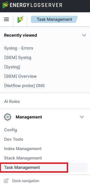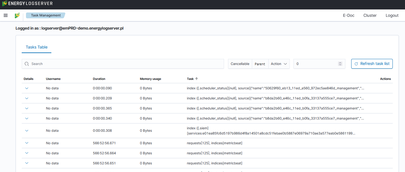 Energy Logserver provides the ability to manage tasks. Table with running tasks is located in Tasks section.