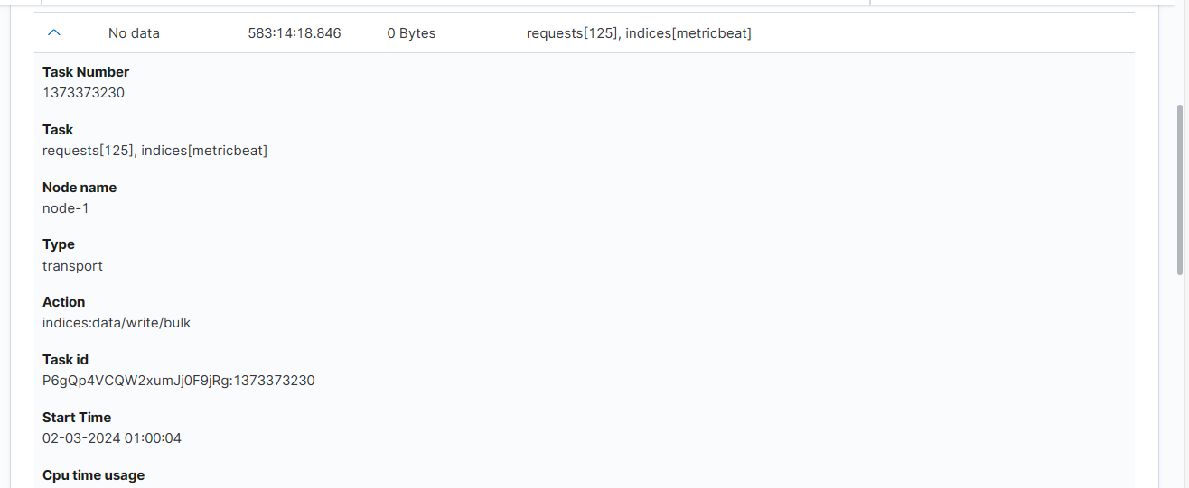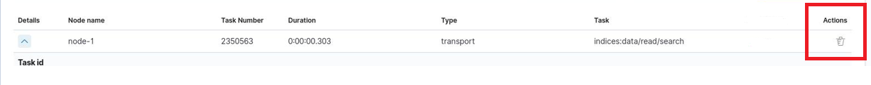 Cancellable- It filters only cancellable tasks.Parent- This option filters only parent tasks.Action- It filters by action ( Sample action:indices:data/write/bulk).Running time in seconds- When checked, only shows tasks that take longer than a specified number of seconds.