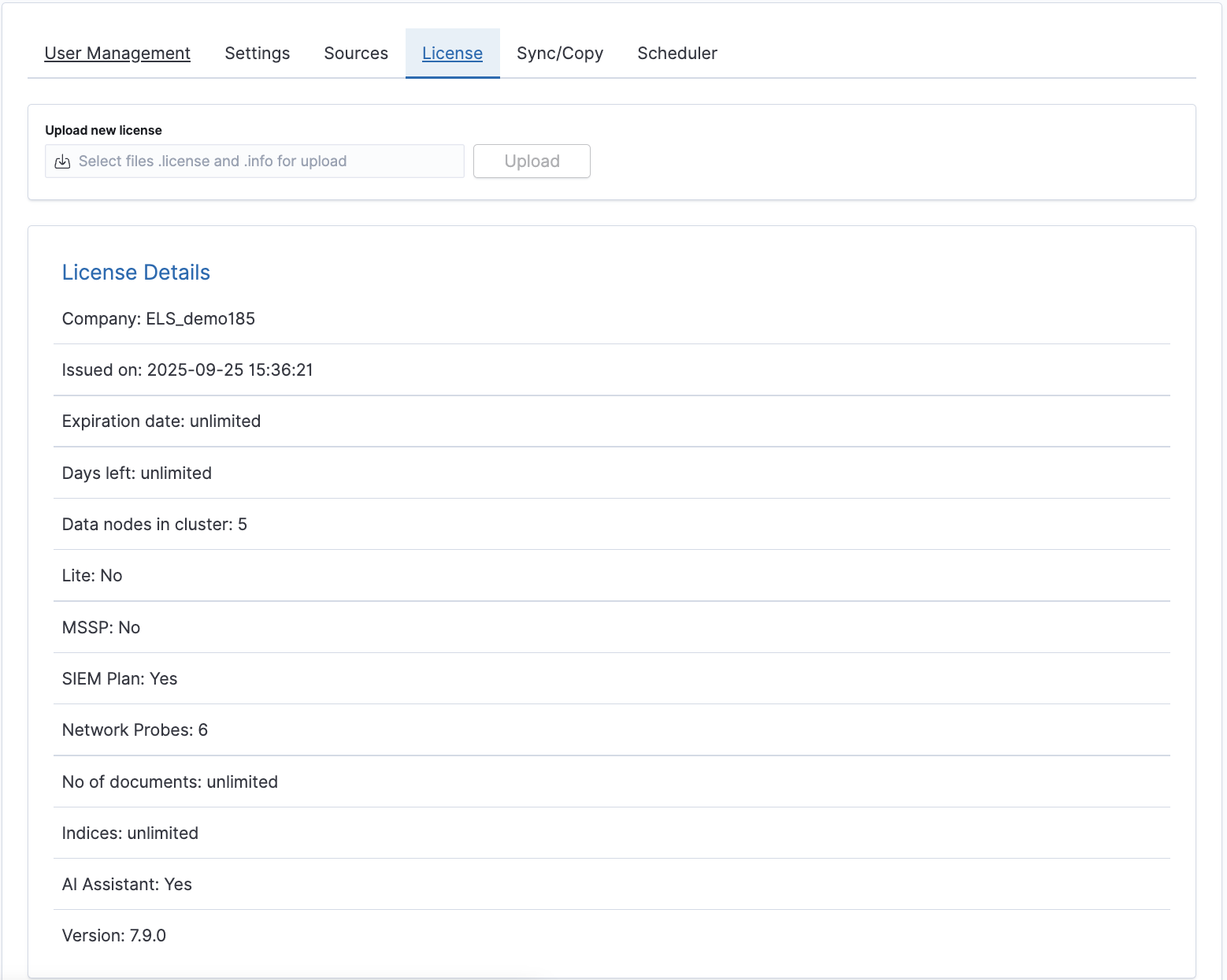 To change the Energy Logserver license files on a running system, use the “Upload new license” option at the top of the “License” tab.