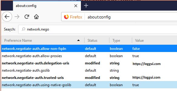 sso.domain: "example.com" ldaps: - name: "example.com" host: "IP_address" port: 389 # optional, default 389 ssl_enabled: false # optional, default true ssl_trust_all_certs: false # optional, default false bind_dn: "esauth@example.com" # optional, skip for anonymous bind bind_password: "password" # optional, skip for anonymous bind (AD admin's password) search_user_base_DN: "cn=Users,DC=example,DC=com" user_id_attribute: "uid" # optional, default "uid" unique_member_attribute: "uniqueMember" # optional, default "uniqueMember" service_principal_name: "HTTP/loggui.com@EXAMPLE.COM" # principal name used while generating the keytab file service_principal_name_password: "Sprint$123" # -pass used during keytab creation